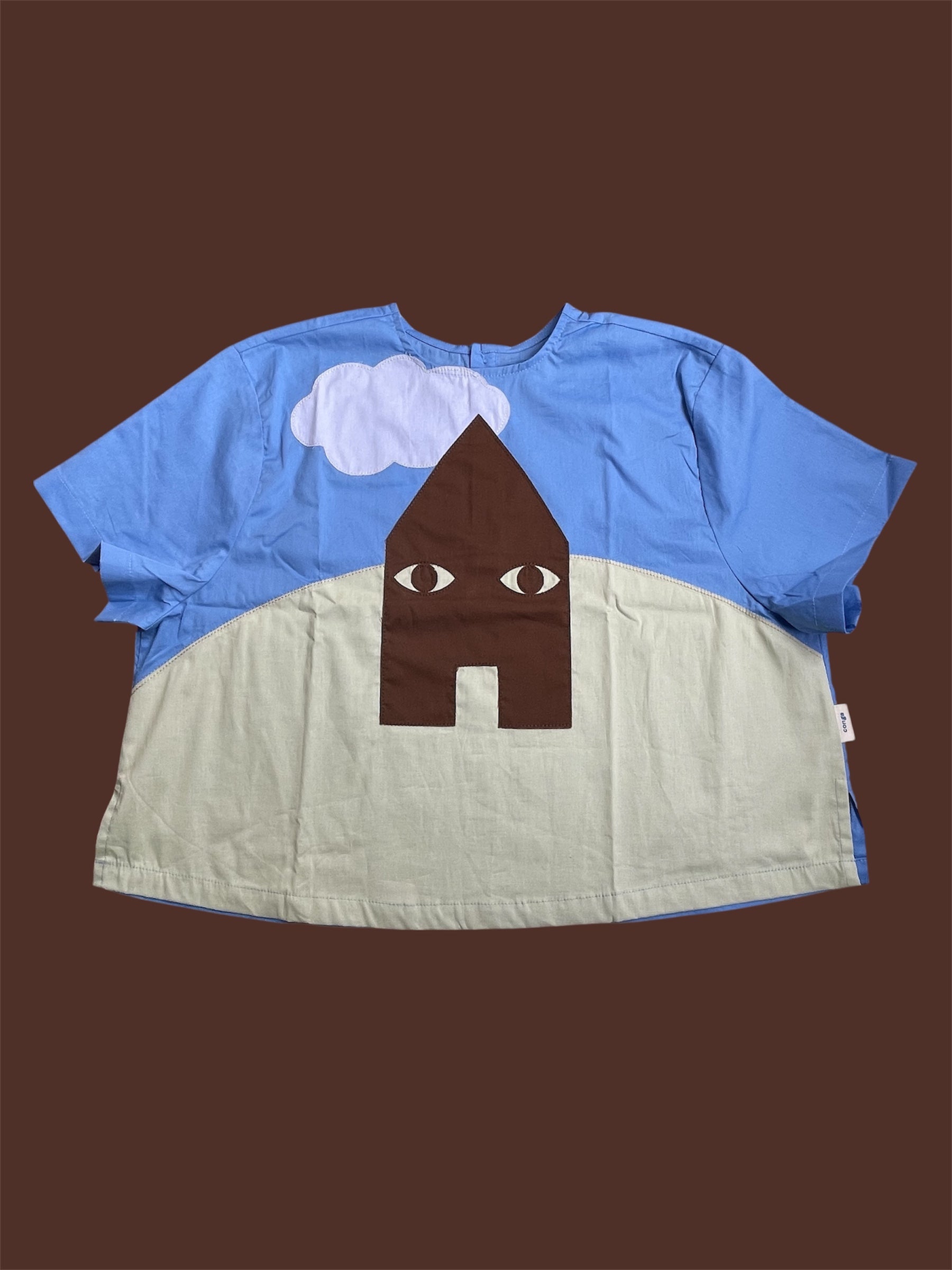 Camisa con cuello de bebe y cuerpo campana. Botón en la espalda y aperturas laterales.