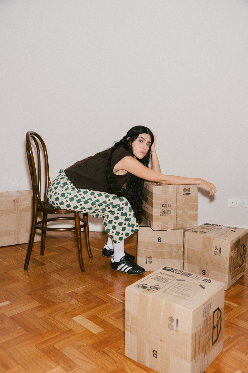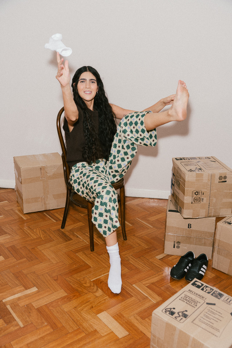 La modelo está usando TALLA S, pero lo tiene doblado en los tobillos.